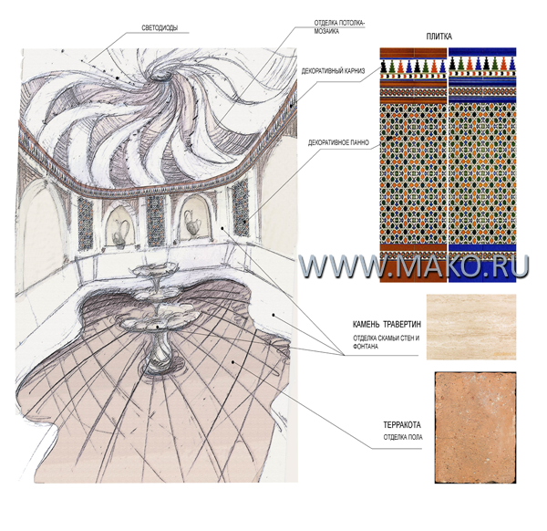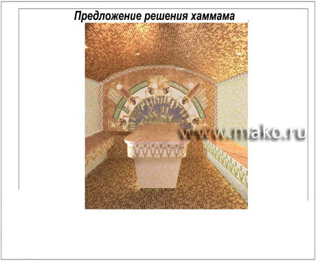 Стоит ли говорить о том, что никакая самодеятельность, верхоглядство и незнание восточного колорита при оформлении хаммама недопустимы?! Вне всяких сомнений, оформлением, дизайном, интерьером турецкой бани должны заниматься профессиональные дизайнеры, а строительством высококлассные опытные мастера. Если же поручить это дело дилетантам, об атмосфере загадочного мира Востока, свойственной хаммаму, придется забыть.