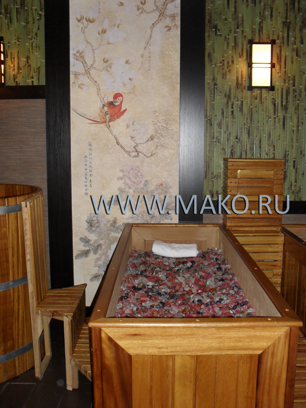 Японская баня офуро – это разновидность домашней (семейной) фуро или общественной сэнто. Только после мытья вместо горячей воды люди погружаются в деревянный ящик (бочку), наполненный смесью кедровых опилок с целебными травами, разогретой до 50°C. Сеанс длится от 10 до 15 минут. Жар пробирает насквозь, пот льется ручьем. Такая процедура уничтожает бактерии, омолаживает кожу и буквально «съедает» жировые отложения (в отличие от эффекта сауны, где потеря веса происходит в основном за счет потери влаги в организме, т.е. является следствием гипогидратации).