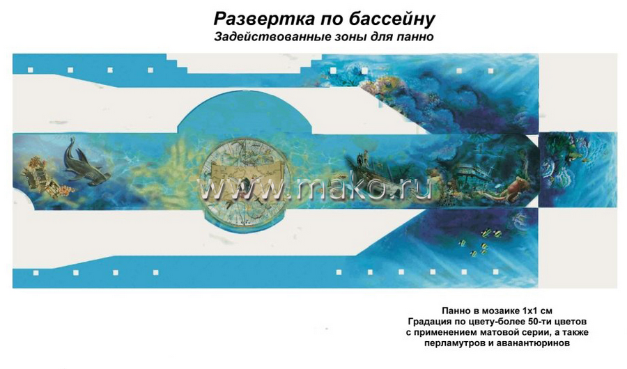 …А за бортом – бескрайнее море с одной стороны, и неясные очертания дальнего берега – с другой, и большой старинный корабль приближается к Вашему борту: кто там? – пираты или вполне дружественные аборигены? Вот такое живописное панно, выполненное по специальной технологии, предусмотрено проектом. Завораживающее зрелище!