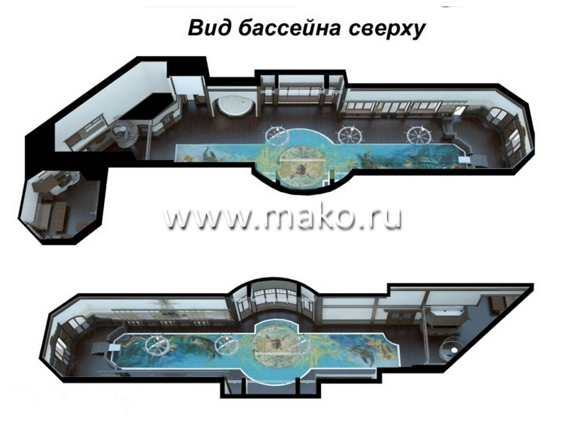 Особенно естественно и вместе с тем оригинально смотрится интерьер в морском стиле в бассейне. Проект такого сооружения, разработанный специалистами нашей компании, позволяет представить все очень наглядно. Вообразите, что Вы заходите в помещение и – крики чаек тут же окружают Вас, шум прибоя услаждает Ваш слух, ласковая вода плещется у Ваших ног… Если проплыть в таком бассейне несколько метров или даже просто полежать на водной глади с закрытыми глазами, ощущение присутствия на море упрочится настолько, что Вы только подивитесь: зачем ехать за тысячи километров к морю, если вот оно – рядом! Да если даже такой бассейн расположен близ морского побережья, он только усилит Ваше комфортное состояние (тем более, если, скажем, непогода подпортила Ваше пребывание на море, либо Вам захотелось морской романтики в бoльшем уюте и комфорте).