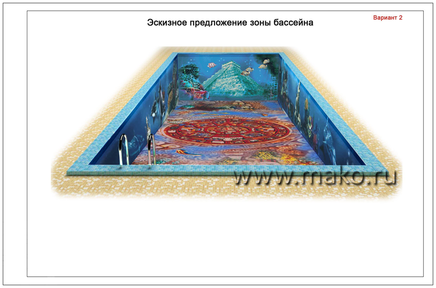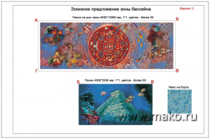 Живописное панно, которое разработали наши дизайнеры и которое могут воплотить в реальность наши мастера-мозаичники, поразит воображение самого унылого пессимиста. Купаясь в таком бассейне, каждый сможет почувствовать себя на том самом месте, которое тщетно искали после «Ночи печали» (именно так была названа та ночная буря) испанские конкистадоры, а позже любопытные (или алчные?) водолазы.