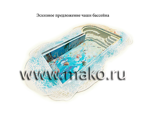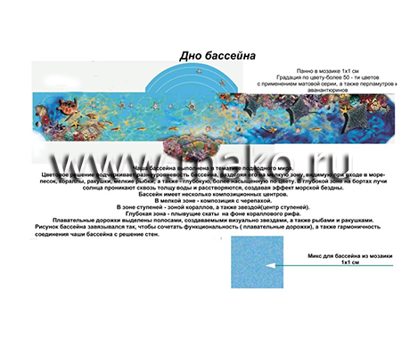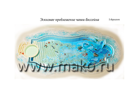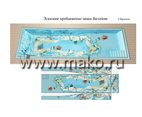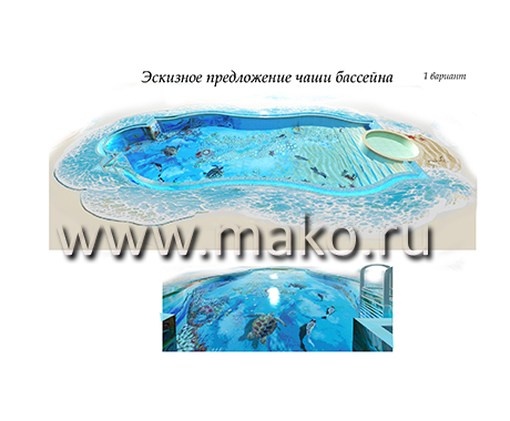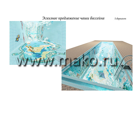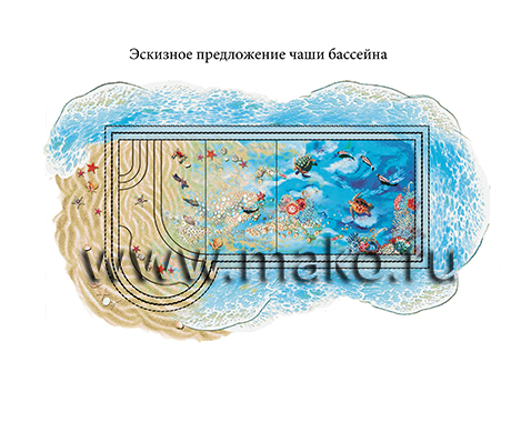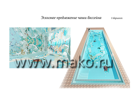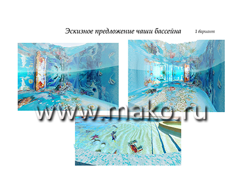 Дизайнеры разработали удивительный по своему содержанию проект, даже эскизы которого неизменно повергают в восторг, настолько все продумано, красочно, впечатляюще. Панно представляет собой морское дно. И тот, кто будет иметь удовольствие плавать и нырять в таком бассейне, вмиг ощутит себя заядлым дайвером. Морские звезды и черепахи, крабы и невиданные рыбы, морские коньки и роскошные раковины, таящие в своих створках жемчуга… Все это проплывает перед взором, движется и колеблется (живет!) в призрачном преломлении света.