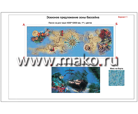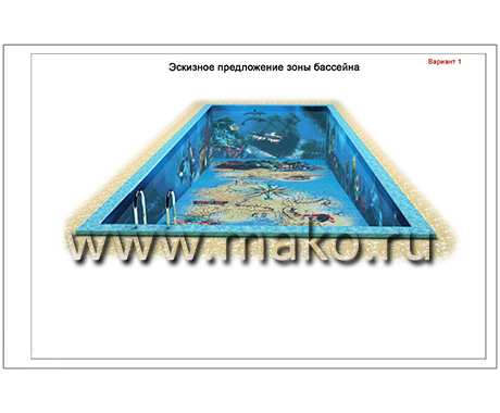Дизайнеры разработали удивительный по своему содержанию проект, даже эскизы которого неизменно повергают в восторг, настолько все продумано, красочно, впечатляюще. Панно представляет собой морское дно. И тот, кто будет иметь удовольствие плавать и нырять в таком бассейне, вмиг ощутит себя заядлым дайвером. Морские звезды и черепахи, крабы и невиданные рыбы, морские коньки и роскошные раковины, таящие в своих створках жемчуга… Все это проплывает перед взором, движется и колеблется (живет!) в призрачном преломлении света.