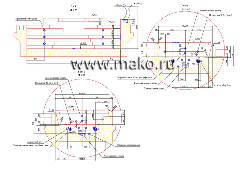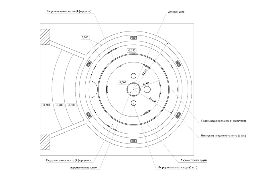 Всевозможные сочетания гидромассажного оборудования для бассейнов СПА и разнообразные цветовые решения современных материалов, применяемых при изготовлении чаш (или широкая палитра мозаики в случае бетонной чаши) дают возможность нашим специалистам создавать бесконечное число вариантов бассейнов СПА.