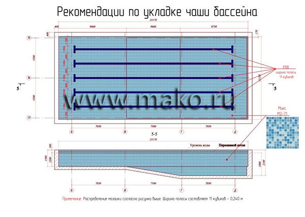 Отделка мозаикой предполагает такие важные этапы, как тотальная проверка на степень влагостойкости поверхности чаш бассейнов, купелей, искусственных ручьев, недопустимость манипуляций с мозаикой после того, как клей вступил в фазу первичного подсыхания, разметка перед укладкой, точность в укладке первых полотен или фрагментов мозаики и т.д.