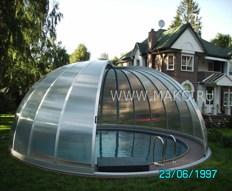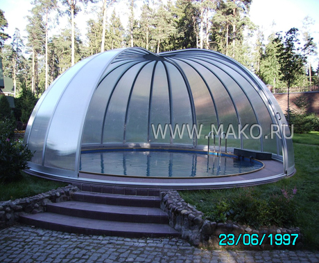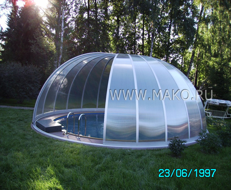 На этот объект невозможно не обратить внимание. Он видится одному инопланетным кораблем, другому – мини-обсерваторией, третьему – большим стеклянным колоколом… Сооружение, действительно, визуально эффектное, даже фантастическое. Речь идет о павильоне для открытых круглых бассейнов от немецкого производителя – фирмы «Campana».