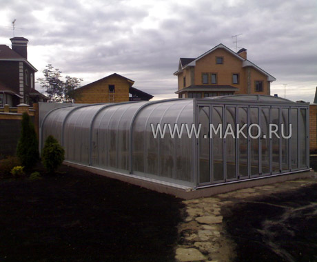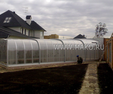 Чтобы такая большая конструкция была устойчивой и стабильной, производитель продумал все: особую прочность профиля для дуг, специальное устройство направляющих рельсов, надежность торцевых стенок и дверей. Поликарбонатные панели, из которых состоят эти стенки, вставлены каждая в отдельную алюминиевую раму, и при необходимости их можно снять по отдельности либо полностью, что очень удобно. Перечислять все достоинства и особенности этой модели можно бесконечно, так их много.