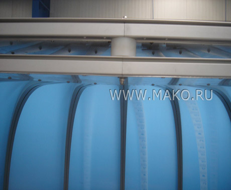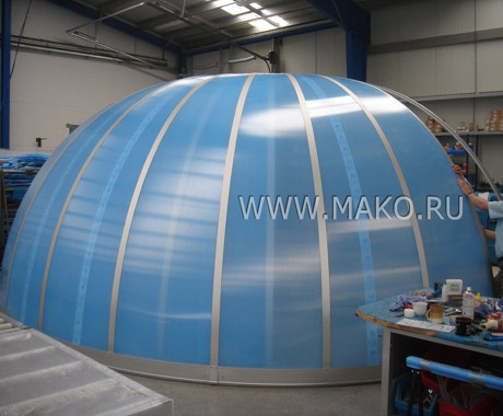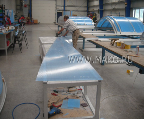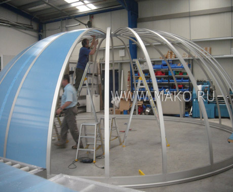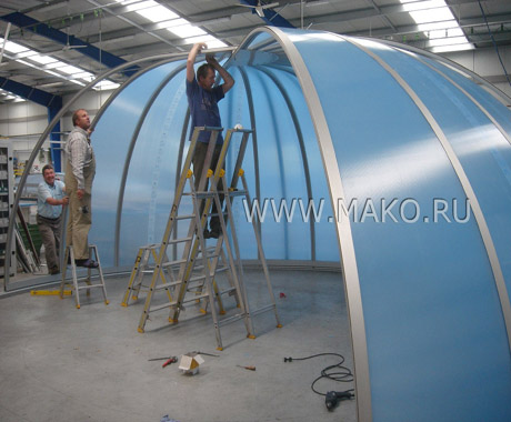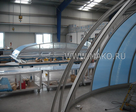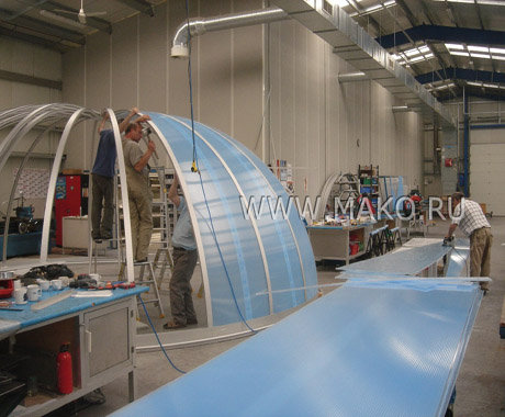Эти арочные модульные конструкции отлично зарекомендовали себя на европейском рынке оборудования и оснащения бассейнов. Панели и структурные профили Campana изготавливаются из высококачественного материала – сотового поликарбоната. Известно, что он в 200 раз(!) прочнее обычного стекла и в 6-8 раз крепче акриловых плит. И в то же время поликарбонатные панели очень легки. Их использование особенно эффективно, когда от строений ожидают сверхпрочности и максимальной светопроницаемости.