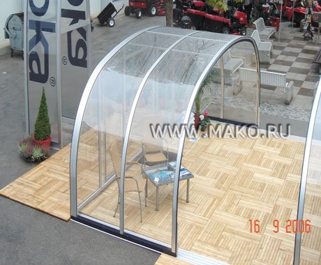 Компания Voroka (г. Эпинген, Германия) с 1964 года производит всевозможные перекрытия. Полиэстер – материал, из которого изготовлялись первые модели. Со временем появлялись новые инженерные разработки, на смену старым приходили более передовые методы и технологии, и вот уже компания наладила выпуск раздвижных и стационарных павильонов из алюминиевого профиля и листов из поликарбоната – материала, устойчивого к воздействию УФ-излучения. Полученные таким образом конструкции были, с одной стороны, изящны и легки, а с другой – необычайно прочны и надежны. Они выдерживали мощные ветровые, температурные, ливневые и снеговые нагрузки.