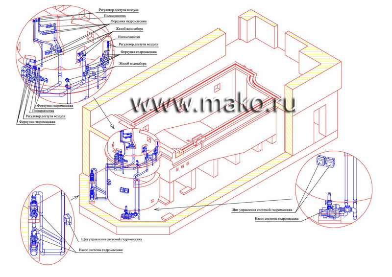 Для поддержания водоема в нормальном состоянии необходимо специальное оборудование плавательных бассейнов. Типовыми проектами предусматривается минимальный набор такого оборудования. Так, обязательными являются системы подогрева, фильтрации и дезинфекции – насосы, электронагреватели или теплообменники, автоматические системы контроля качества воды и т.д. Помимо установок подготовки и очистки воды, в индивидуальном проекте или при переработке типового, Вы всегда можете заказать оборудование для развлекательных или оздоровительных целей. Это гейзеры и аэромассаж, водопады и противотоки, устройства для подводного освещения, горки и трамплины.