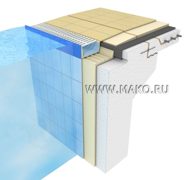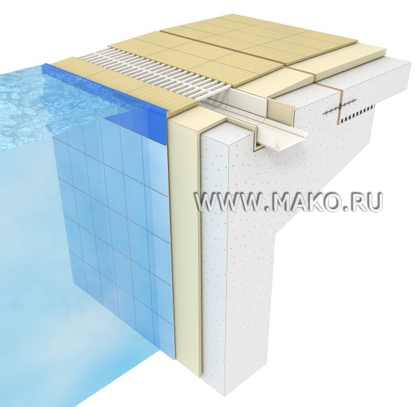Финский желоб. Данному типу конструкции свойственна наклонная поверхность, поднимающаяся от стенки бассейна к переливу, и рифленая плитка для ручного захвата. Даже при возникновении больших волн вода быстро «успокаивается». Звукопоглощающий водослив. Чистка сливной канавки производится с обходной дорожки. Специалисты рекомендуют оборудовать «Финский берег» в больших спортивных бассейнах.
