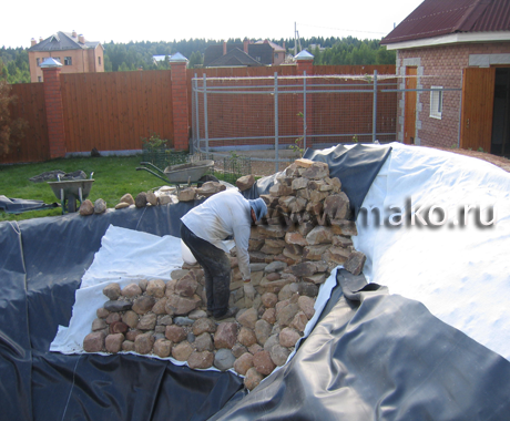 — бетонирование (если возводится пруд бетонный) или укладка пленки, либо установка готовой жесткой пластиковой чаши;